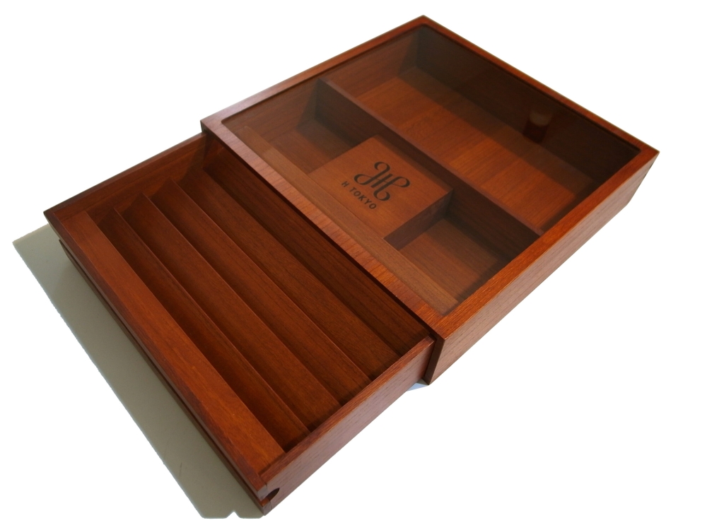 Handkerchiefs for about a week can be contained in a size 420*420*100 box made of only solid wood of paulownia. It was designed under the concept that the collected handkerchiefs can be smartly contained and it can be used in a long time.