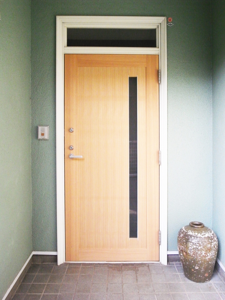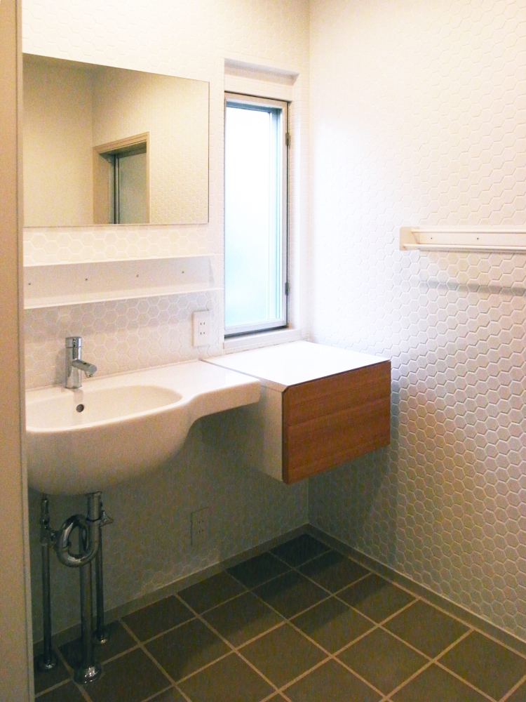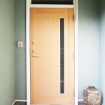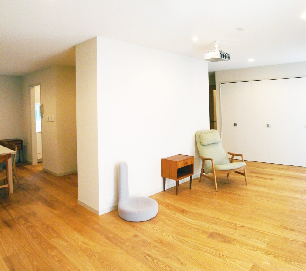 A large living-dining room has been restructured by gently connecting the 1st floor separated into small rooms leaving their structures and has been designed based on the natural wood grain with consideration for balance among an existing part to leave, a recolored reuse part, and a newly built part.