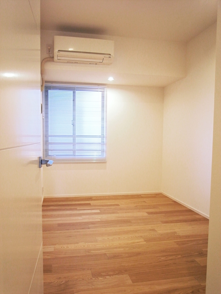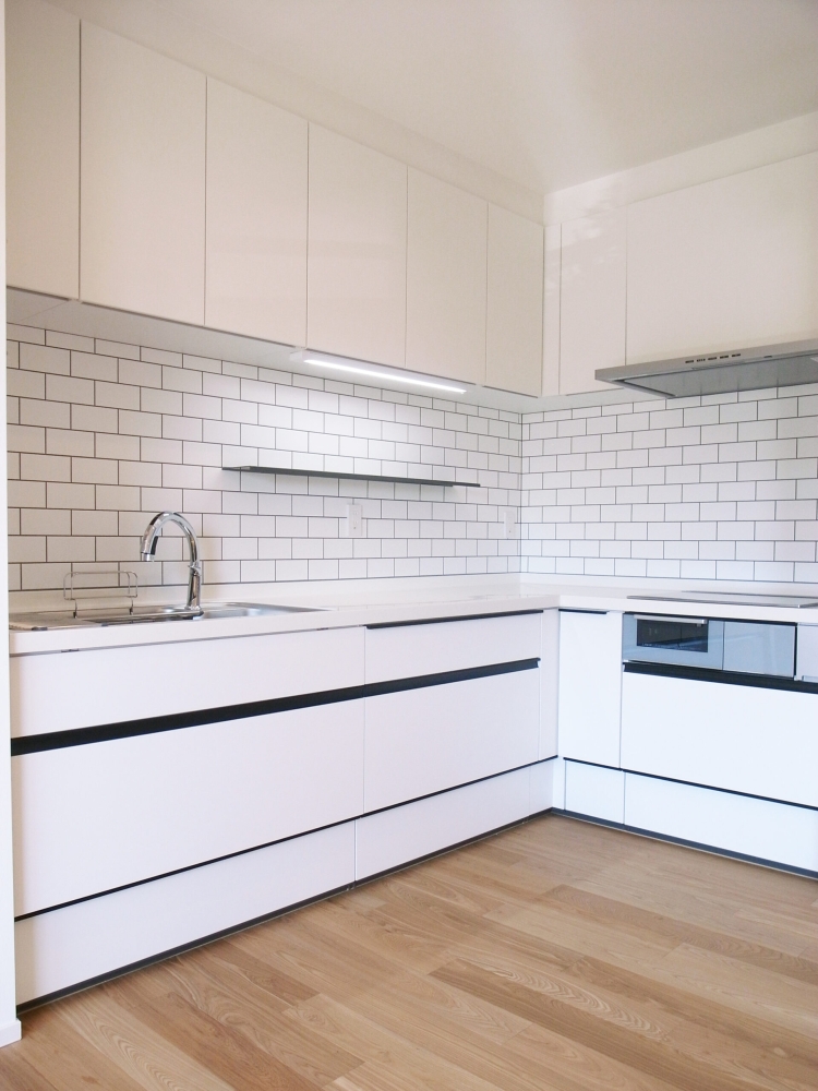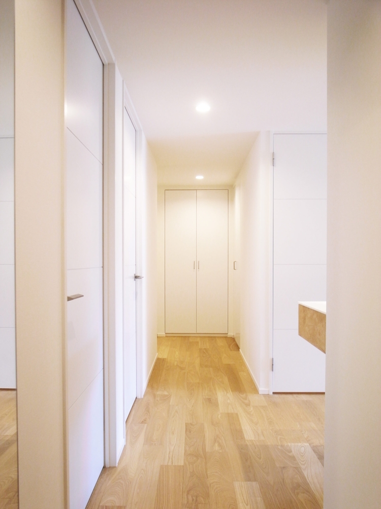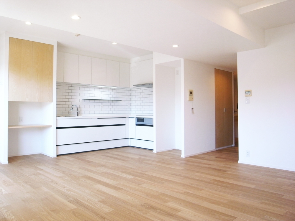 集合住宅のフルリノベーション。 代表的な3LDKの間取りを、収納を整理することでエントランスを大きくし、ひとつながりの大きなキッチン/ダイニング/リビング空間、家族で使う大きなウォークインクローゼット、廊下に面した手洗いを作ることで、家族のライフスタイルに合った暮らしやすい住居空間へリフォームしました。
